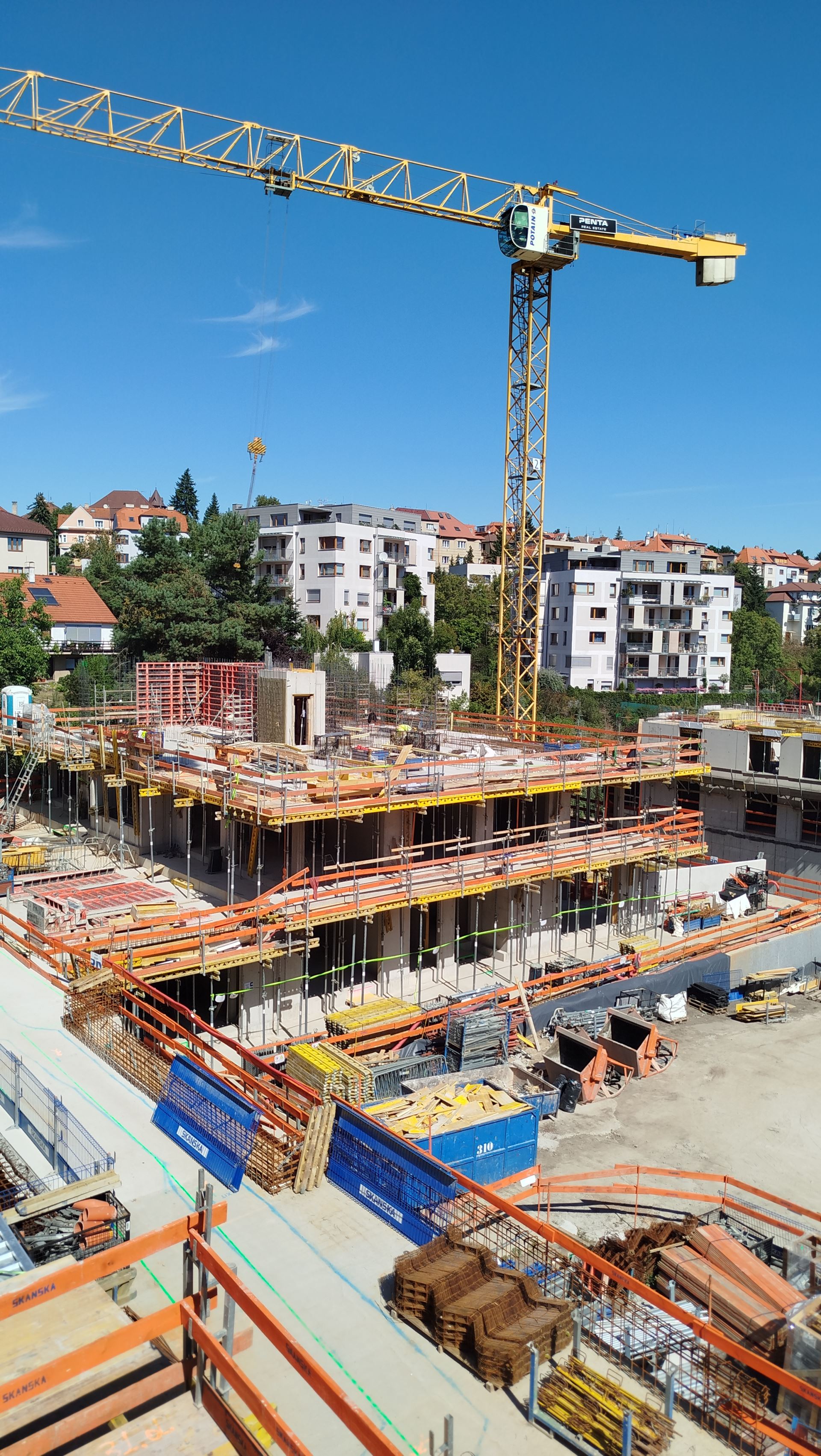 První bytový dům je tvořen dvěma bloky o 6 až 7 nadzemních podlažích, přičemž nejvyšší patro je vždy ustupující. Bloky mají společnou dělící stěnu a jsou vzájemně propojené v úrovni podzemního podlaží a prvního nadzemního podlaží. Samostatné půdorysné oddělení vzniká až v ustupujících patrech.